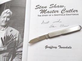 At first glance this looks like one of the (very!) many 2-blade s/steel knives produced in Sheffield over the years, but on closer inspection you will see it has come from the talented hands of that great Sheffield 'Little Mester' - Stan Shaw, now sadly deceased. Whilst Stan's work never really reached the level of the best USA slipjoint Makers, he had a pedigree unequalled (and envied by US makers) and was rightly revered by all of us who love hand made folders and waited patiently on his list for a knife. Main blade:2 inches. Pen blade: 1-5/8 inches. Closed; 3-1/4 inches. Nice main blade 'snap' opening/closing although the pen blade is a little 'lazy' on opening but snaps nice on closing. The blades show a few rub marks and the body shows handling/storage marks. His work will only become harder to obtain as the years go by and more collectors seek his work.