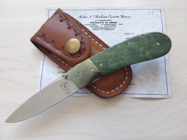 I first became aware of Kansei's knives at the SICAC Knife Show in Paris, France, where he was part of a contingent of Japanese Knifemakers who regularly attended the show. The Japanese knife collectors have a particular fondness for Bob Loveless and he had a huge following there, so it's no surprise to their Makers replicate his knife designs. What set Kanei apart - and made him unique - was that he made folding versions of Bob's models, an even harder task to accomplish. This is an excellent version of Bob's New York Special, handled in Bob's favouriter materials - green micarta with red liners and with a Liner-Lock locking mechanism. Superb grind lines and excellent workmanship means that will be a knife that gives a lot of 'Pride of Ownership'. Closed:4 inches. Blade:3-1/8 inches. This knife is out of a Collection.