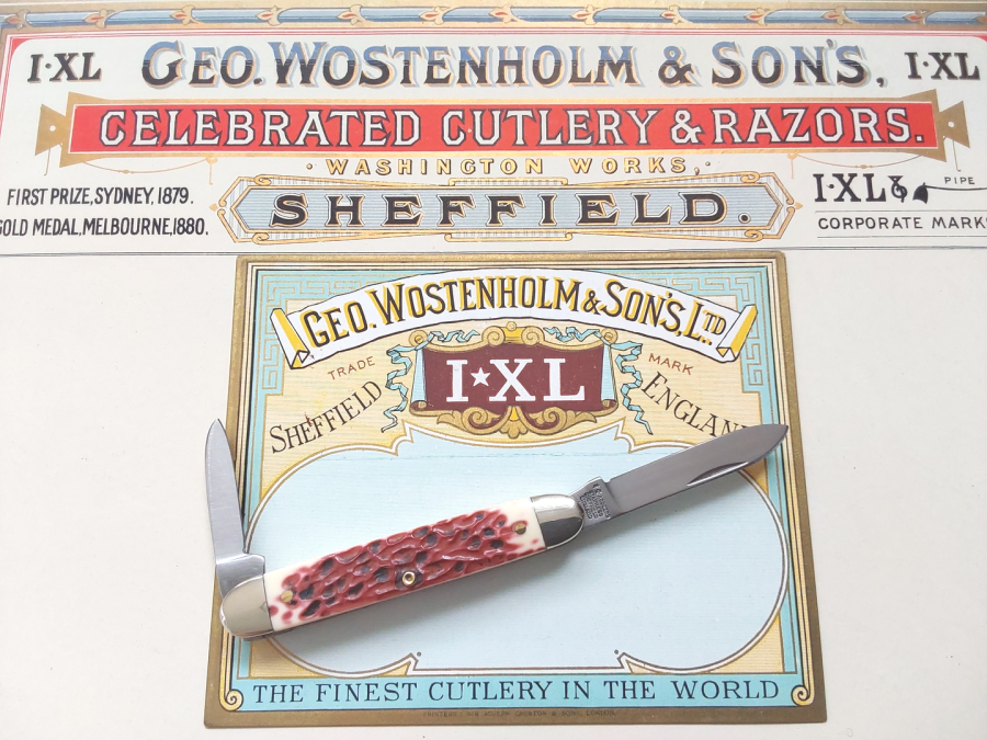 A nice, Made in Sheffield, example of a latter day 2-blade from the Egginton Group of Companies. Faux Jigged Bone scales, with n/silver bolsters and a main Spearpoint blade (1-5/8") and smaller Pen blade (1-1/8"). Both blades shut with a nice 'snap' although both are 'lazy' on opening. Closed length: 3 inches. Complete with original box, which shows storage marks. Mint, unused condition. £35 inc. UK p&p.