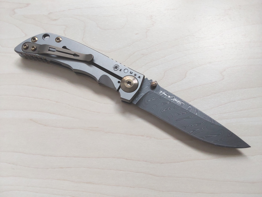This particular version from the Spartan/Harsey Series, has now been discontinued. Designed by the renowned William 'Bill' Harsey and coupled with the superb quality offered by Spartan Blades, makes this a knife that would please the most critical of collectors. With a titanium liner-lock frame and Damascus blade plus anodised bronze fittings, this is an eye catching folder with superb ergonomics. ( I would place the quality of this knife on a par with a CRK ! ). Blade:3-1/4 inches. Closed:4 inches.