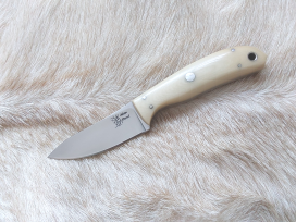 A very nice example of a Mini Hunter with the kudos of being made by Alan himself - and not a mass produced factory-made version. Handled in 'Bone' coloured Micarta ( which shows a very slight cosmetic 'shading' where the handle has been exposed to the sunlight, adding a little character) with a s/steel blade and pins. Complete with original swivel sheath showcasing Alan's superb leather work.