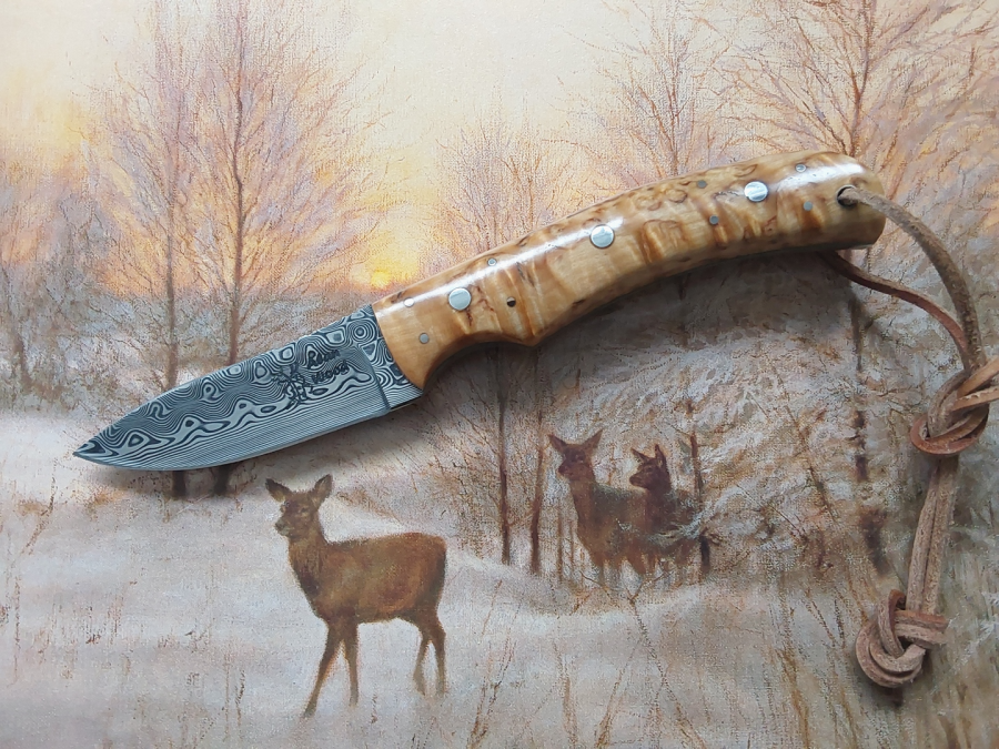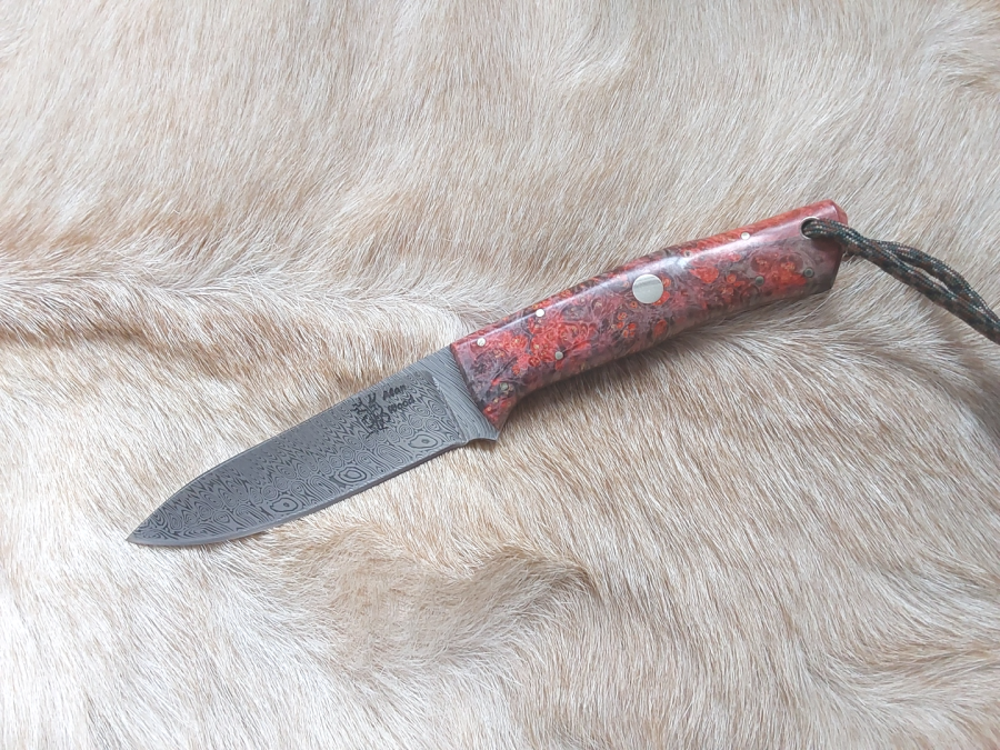A gorgeous looking knife that certainly gives that 'pride of ownership' feeling. Handled in 'red' Masur Birch, with white liners wrapped around premium RWL34 steel, this is a knife that will work as good as it looks and punch above it's weight, despite it relatively small size. In the right hands, this knife is capable of performing admirably. Blade: 2-1/2 inches. Oal: 6-1/4 inches. Complete with leather belt sheath and kydex pocket/neck sheath. New from Maker.
