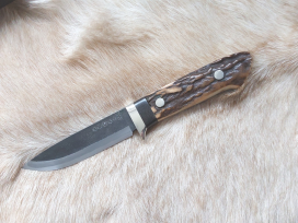 A superb knife from this Japanese Maker who is a Third Generation Master Bladesmith and known for his hand forged and very sharp knives. While the main demand for his work are his various styles of kitchen knives, Shosui does make the occasional 'sheath knife' which in the true tradition of Japanese Swordmaking is then passed on to another specialist to fit the handle and guard after he has forged the blade. Another specialist then makes the leather sheath. Rarely available in the UK, this is a unique opportunity to acquire a hand forged knife with a great background and pedigree. Stag handle with micarta spacer and n/silver guard. Blade:4-1/8 inches. Oal:8-7/8 inches. Complete with original leather sheath (which shows a few 'insertion' nicks from this very sharp blade tip). Mint unused condition. £495 inc. UK p&p.