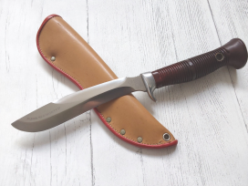This model first appeared in Alan's 1999 catalogue but was discontinued for the 2000 edition, although a different version did show up in his 2002 catalogue. This is what he had to say about it in 1999 - "Tough belt knife for rough use and emergencies. Simple construction with integral double guards, slab handles on a full, tapered tang secured by two handle bolts and a large thong tube. Flat grind is standard with a brushed finish. Heavy edge bevel to withstand most abuse". The seller has forgotten the type of steel but Alan has written 01 on the back of the sheath and there is also an extremely small 'sliver' of tarnish near Alan's logo to suggest this is a carbon steel. Blade:5 inches. Oal:9-3/4 inches. Handle is brown Micarta. Complete with a superb brown leather sheath by Alan.