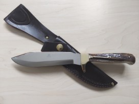 At first glance, you can tell this knife carries the 'DNA' of the iconic Puma White Hunter, although a more pared back version. If you ever wanted a White Hunter without all the 'bells & whistles' then this knife from the original Linder company could be for you. S/steel blade, brass guard and Stag handle. Blade:6 inches. Oal:10-1/2 inches. Complete with original brown leather sheath. Mint, unused condition. £225 inc. UK p&p.