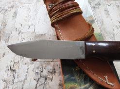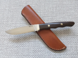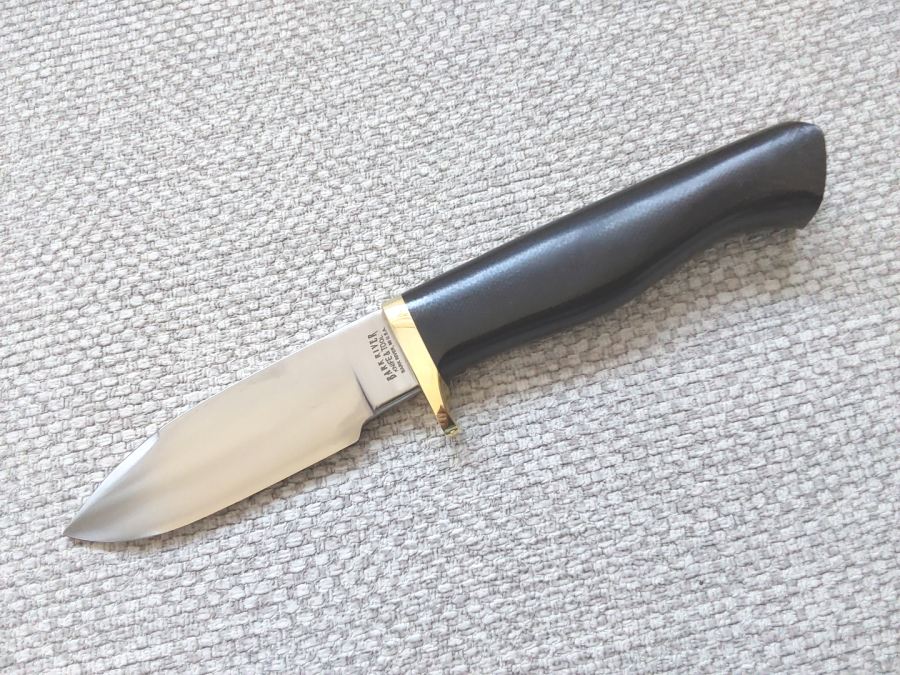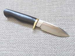 A lovely knife from Alan's back catalogues, first shown in his 1995 catalogue as a 'Spike'. Possibly re-named due to this PC and 'Woke' climate we now live in, it was descibed as thus: "Ultra slim utility-boot knife. Has proven extremely popular at shows. Grooved or stippled bolster area for secure grip. With slim sheath. Blade: 3-3/8 inches.