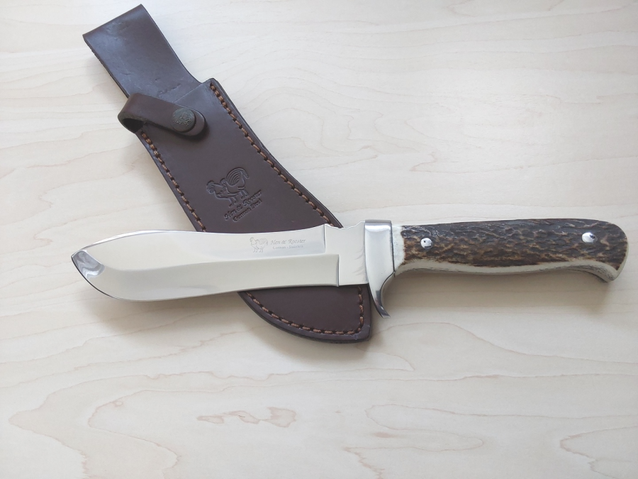 Hen & Rooster seem to have a checkered history of ownership and the knives are no longer made in Germany, with some knives now made in China and some in Spain, with the Spanish knives made from German s/steel and gaining higher praise. This knife - which appears to be discontinued - is a Spanish made knife as denoted on the tang. Another knife with some of the fabled Puma 'White Hunter' DNA, this is a well made knife that would serve the user well. Red Deer antler scales and s/steel guard. Blade:6 inches. Oal:10-1/2 inches. Complete with original brown leather belt sheath.
